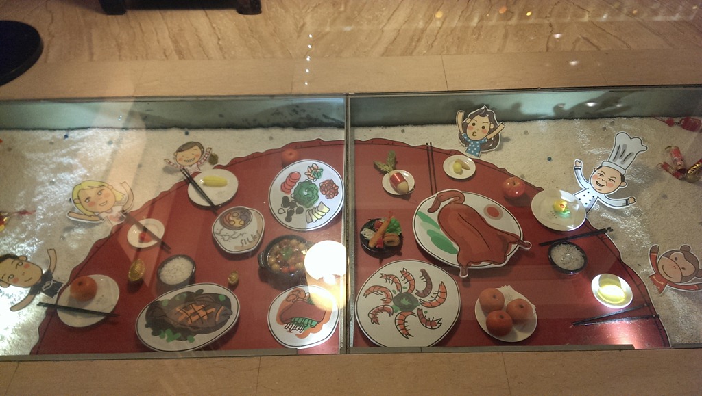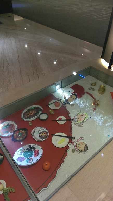 地板上也鑲著傳統會放的團圓菜,還有很多奇怪的人一起吃飯!